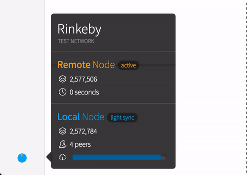 최근 버전 0.11.0이후로는 Mist 내에서 활성 노드, 로컬 노드 동기화 진행률, 기타 네트워크 및 동기화 세부 정보를 알려주는 일부 UI가 도입되었다. 아래처럼ㅎㅎ